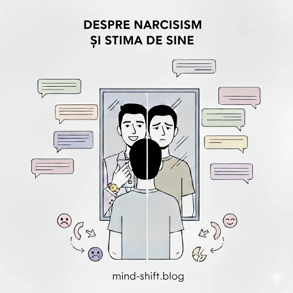 Imagine generată cu Gemini 2.5 Flash. Copyright @mind-shift.blogCum vulgarizarea termenilor din psihologie și promovarea unor sfaturi de tip „rețete magice valabile pentru toată lumea” au devenit o practică tot mai des întâlnită pe internet, m-am decis să scriu despre narcisism și stima de sine (cunoscută și sub denumirea de „deficit narcisic”), în speranța de a aduce puțină lumină și de clarifica legătura dintre ele.