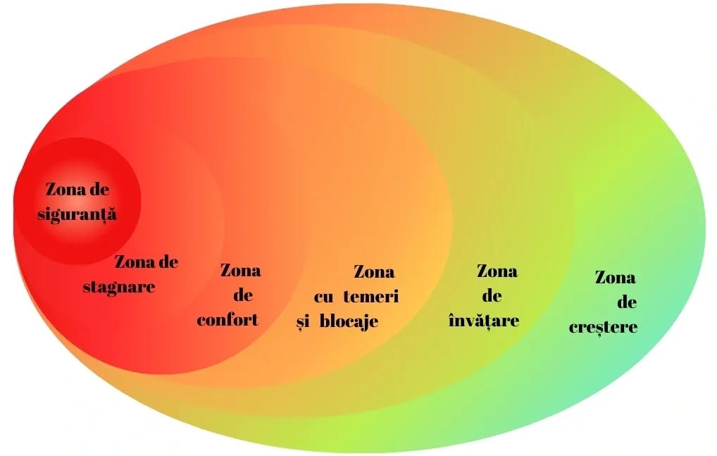 Obiectivul nu este să fugim de zona de confort (dar nici să rămânem blocați în stadiul de stagnare), să stăm în situații nepotrivite pentru noi (poate chiar toxice), pentru a deveni rezilienți și creativi, ci să extindem această zonă de confort pentru a face cât mai ușor tranziția către zona de creștere.